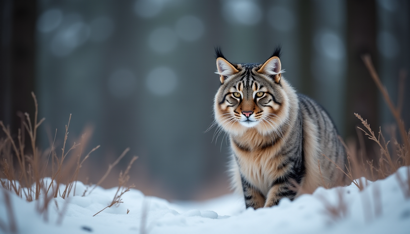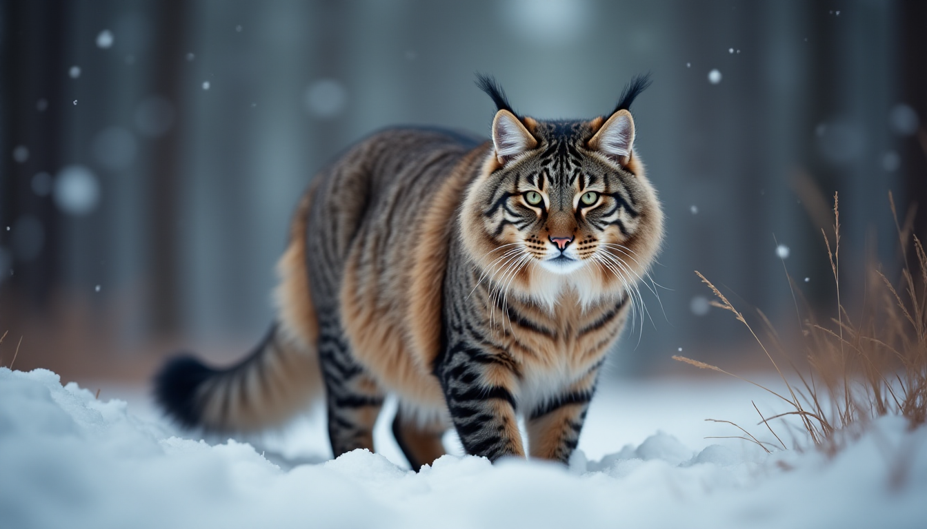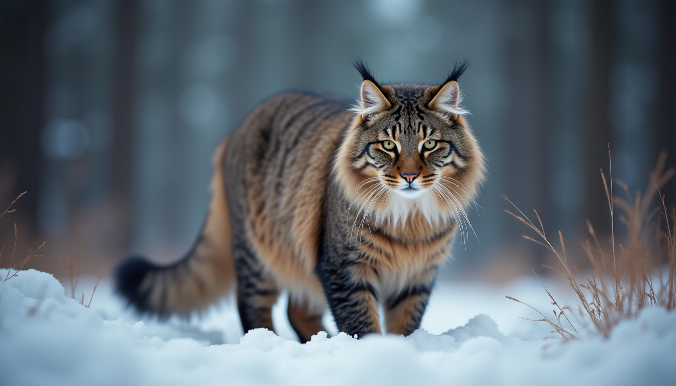 프롬프트: Photo of a siberian cat in russian forest, national geographic winner, photo of the year, bokeh, winter