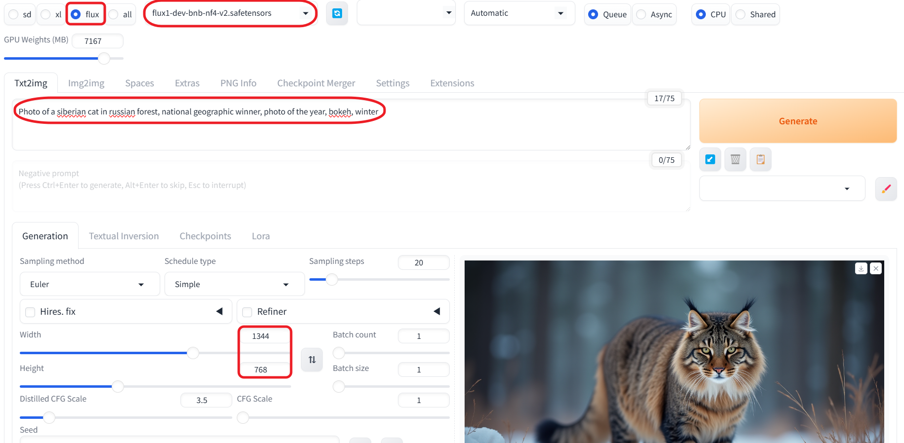 VRAM 이 충분하다면 체크포인트 파일을 flux1-dev-fp8.safetensors 로 사용하셔도 됩니다. 나머지 값은 그냥 둬도 됩니다. 마지막으로 [Generate]버튼을 누르면 이미지가 생성됩니다.