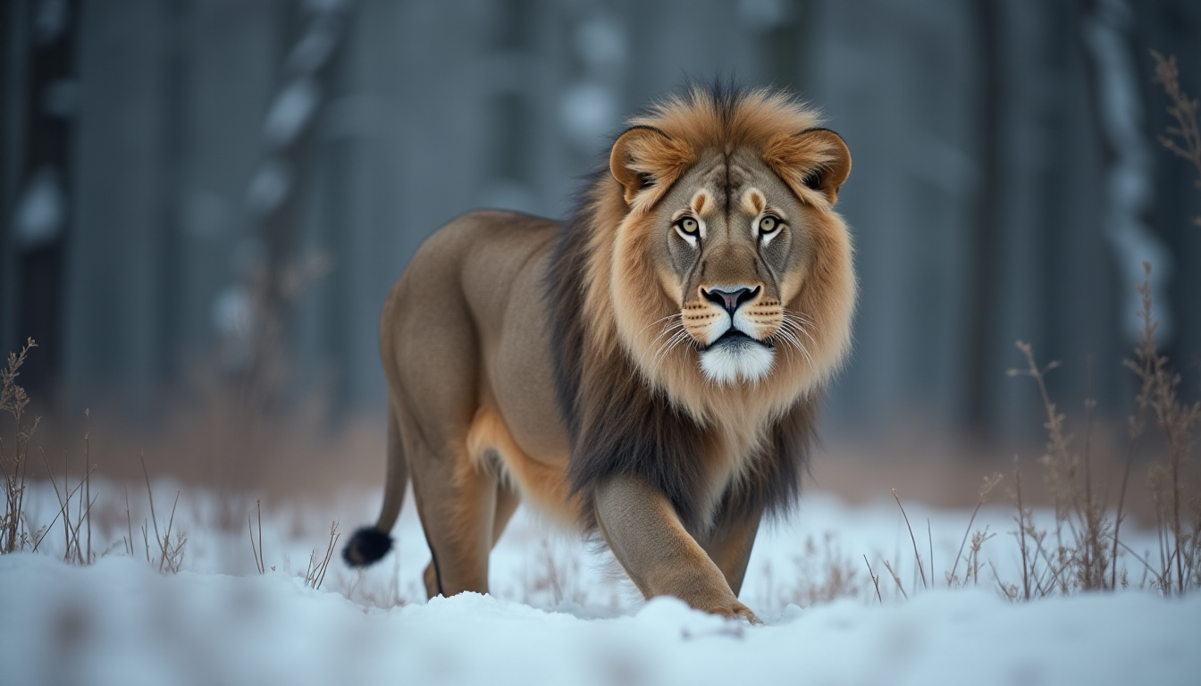 프롬프트: Photo of a lion in russian forest, national geographic winner, photo of the year, bokeh, winter
