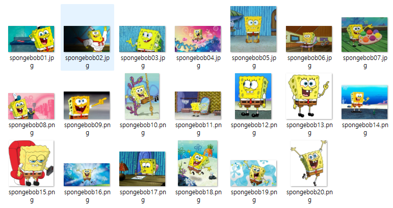저는 스폰지송 LoRA를 만들어보기 위해 구글에서 20개의 이미지를 찾았습니다. 원본 이미지가 많아서 포맷 변환외에는 거의 그대로 사용했습니다.