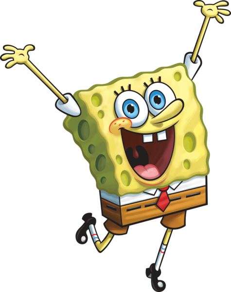 This image is a digital cartoon illustration of SpongeBob SquarePants, a popular animated character known for his cheerful and energetic personality. SpongeBob is depicted with a yellow, rectangular body, typical of his design, with a square head and arms that extend out to the sides, giving a sense of joy and exuberance. His eyes are large, blue, and expressive, with thick, black eyelashes. SpongeBob's mouth is open wide, showing his pink tongue and teeth, conveying a sense of excitement or laughter. His skin is textured with small, yellow patches, resembling sponge material, and he has two small, round red spots on his cheeks. SpongeBob wears a white shirt with a red tie, and brown shorts with a white stripe on the sides. His shoes are black with white soles. The background is solid black, making SpongeBob the sole focus of the image, with no other objects or people present. The style of the illustration is bright and colorful, typical of animated cartoons, with smooth lines and vibrant colors that give it a lively and playful feel. |