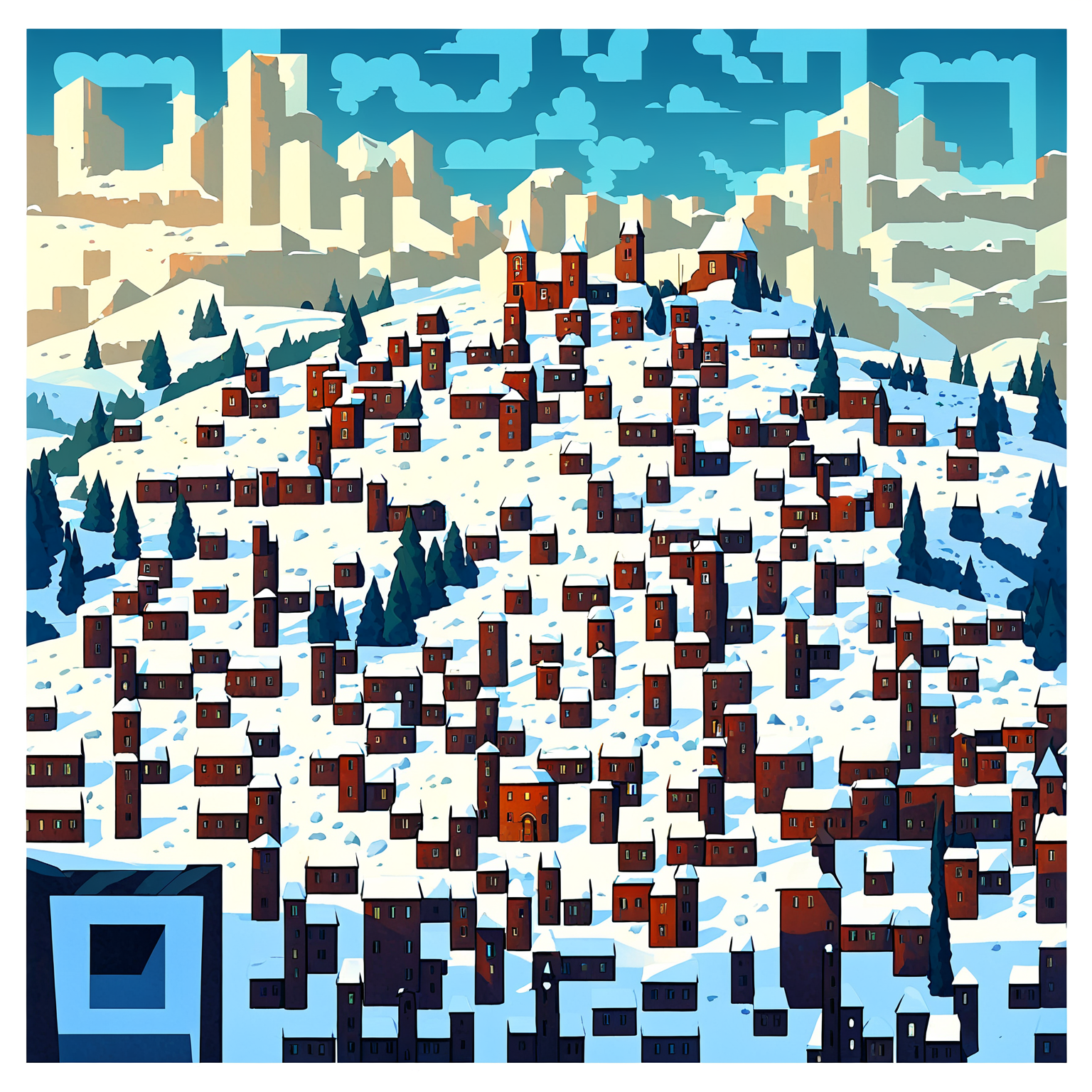 프롬프트: a cubism painting of a town with a lot of houses in the snow with a sky background, Andreas Rocha, matte painting concept art, a detailed matte painting