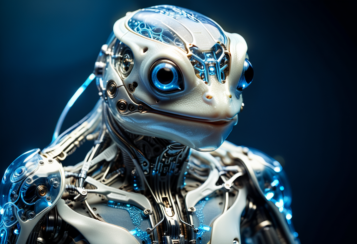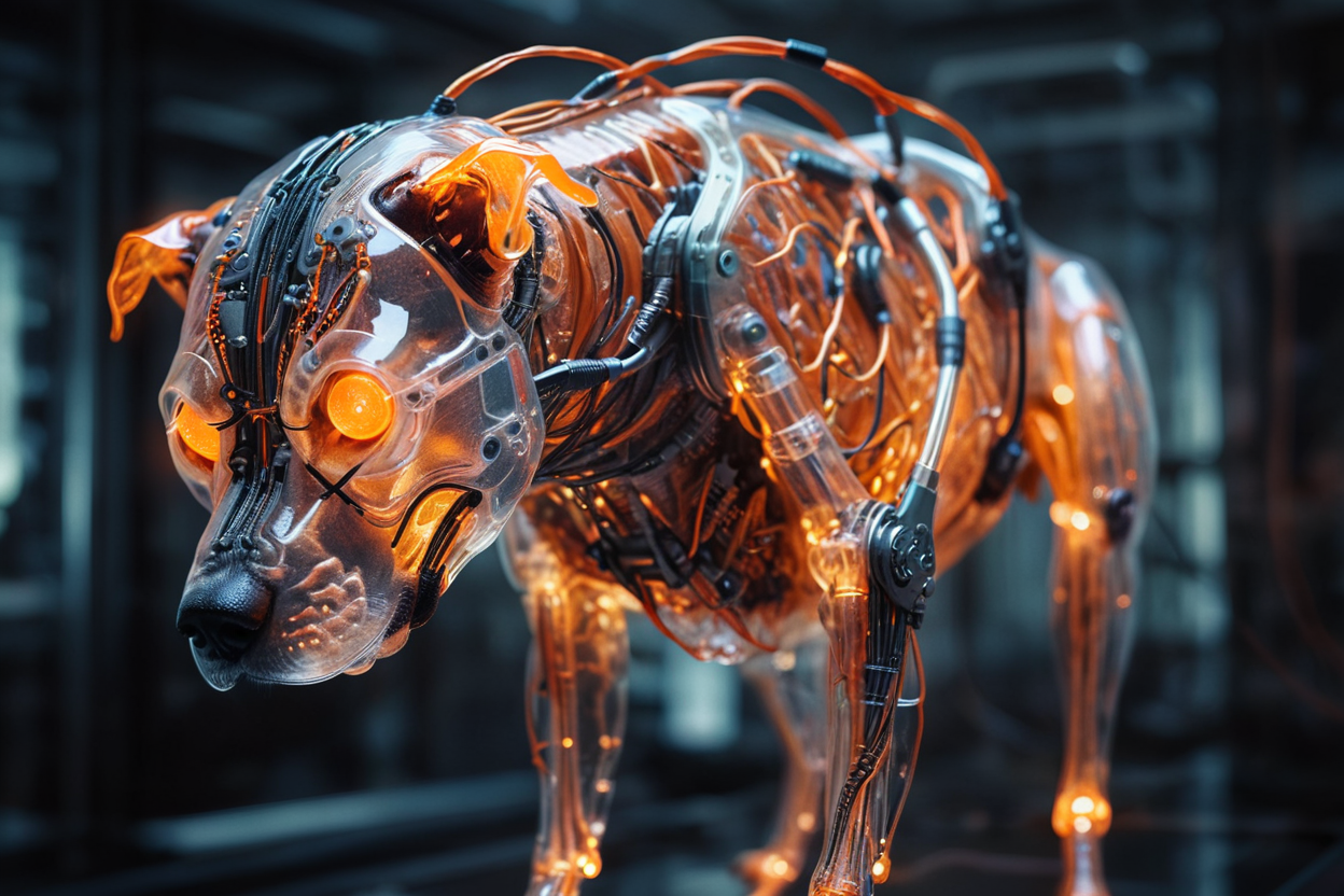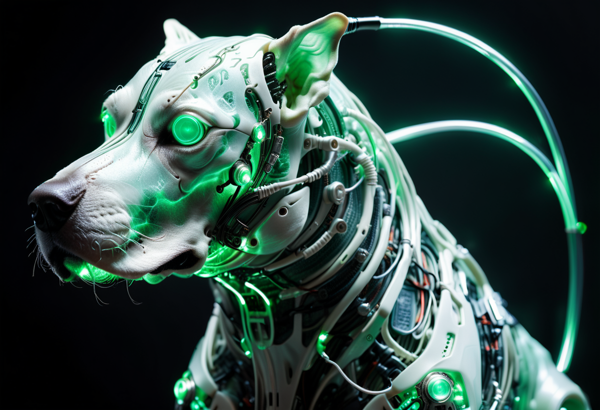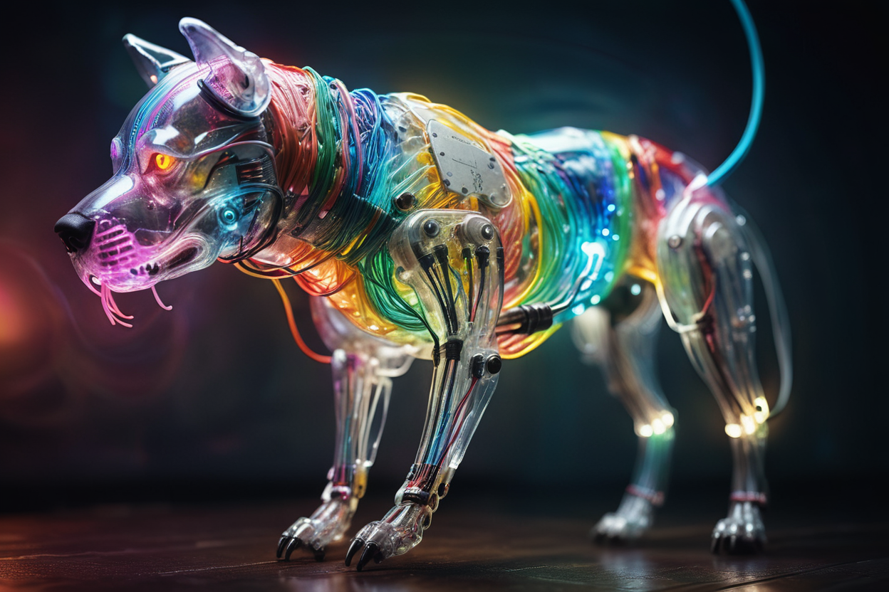 프롬프트: cinematic film still of a translucent (cybernetic-like:1.3) {dog|frog|tiger}, {red|blue|green|rainbow-colored} (glowing veins cables:1.1), circuits, titanium transparent body, biomechanical, extremely detailed, vignette, bokeh, moody, epic, gorgeous, film grain, grainy