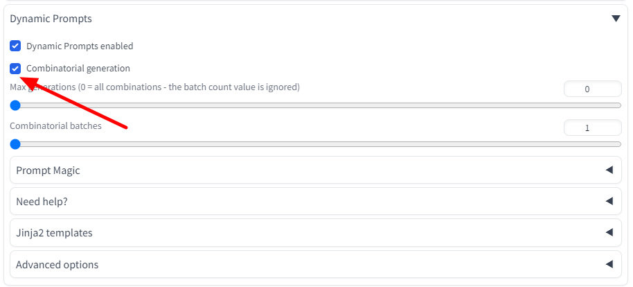 예를 들어 "Combinational Generation" 옵션을 사용하면 이러한 조합을 무작위로 출력하는 것이 아니라, 모든 경우를 한꺼번에 생성할 수 있습니다. 예를 들면 "A girl with {gold|black|amber} hair in {jeans|skirt} "라고 한다면 3가지 머리색, 2가지 하의를 조합해서 총 6가지를 한꺼번에 생성할 수 있습니다.