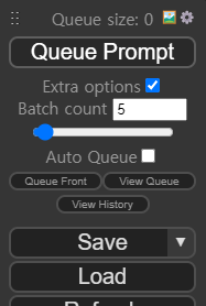 또는 [Queue Prompt] 버튼 아래에 있는 Extra options를 누르면 아래와 같이 확대되는데, 여기에서 Batch count를 원하는 대로 설정해주시면 됩니다.