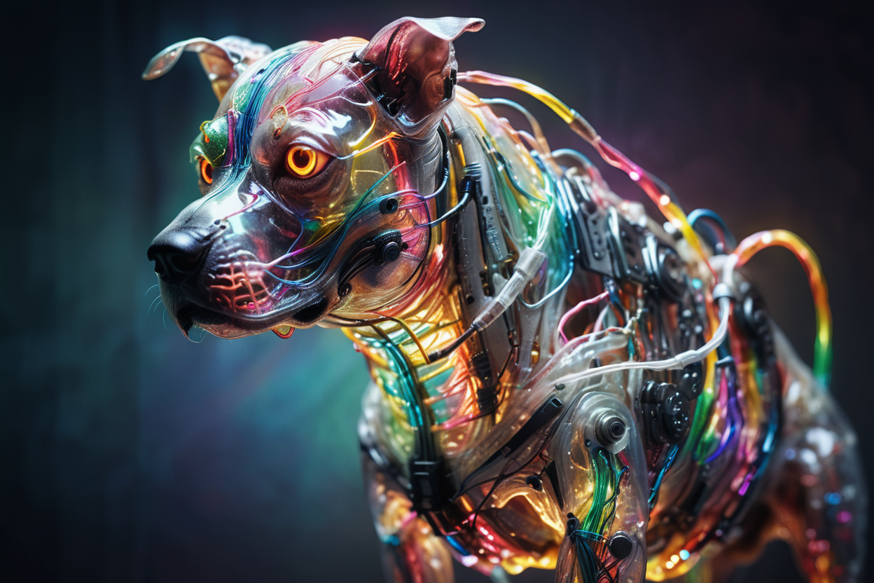 프롬프트 : cinematic film still of a translucent (cybernetic-like:1.3) (dog:1.2), {orange|red|blue|green|rainbow-colored} (glowing veins cables:1.1), circuits, titanium transparent body, biomechanical, extremely detailed, vignette, bokeh, moody, epic, gorgeous, film grain, grainy <lora:xl_more_art-full_v1:0.7>
