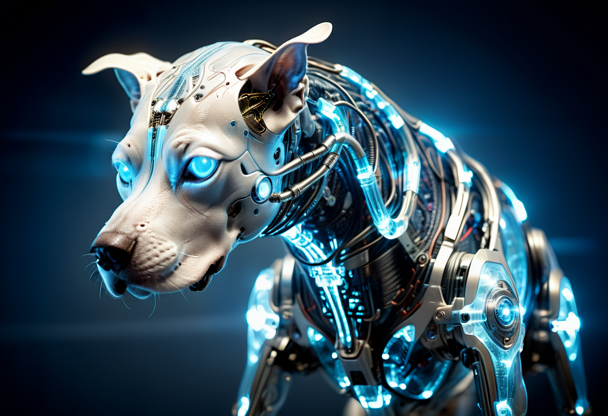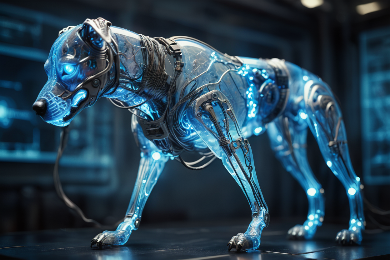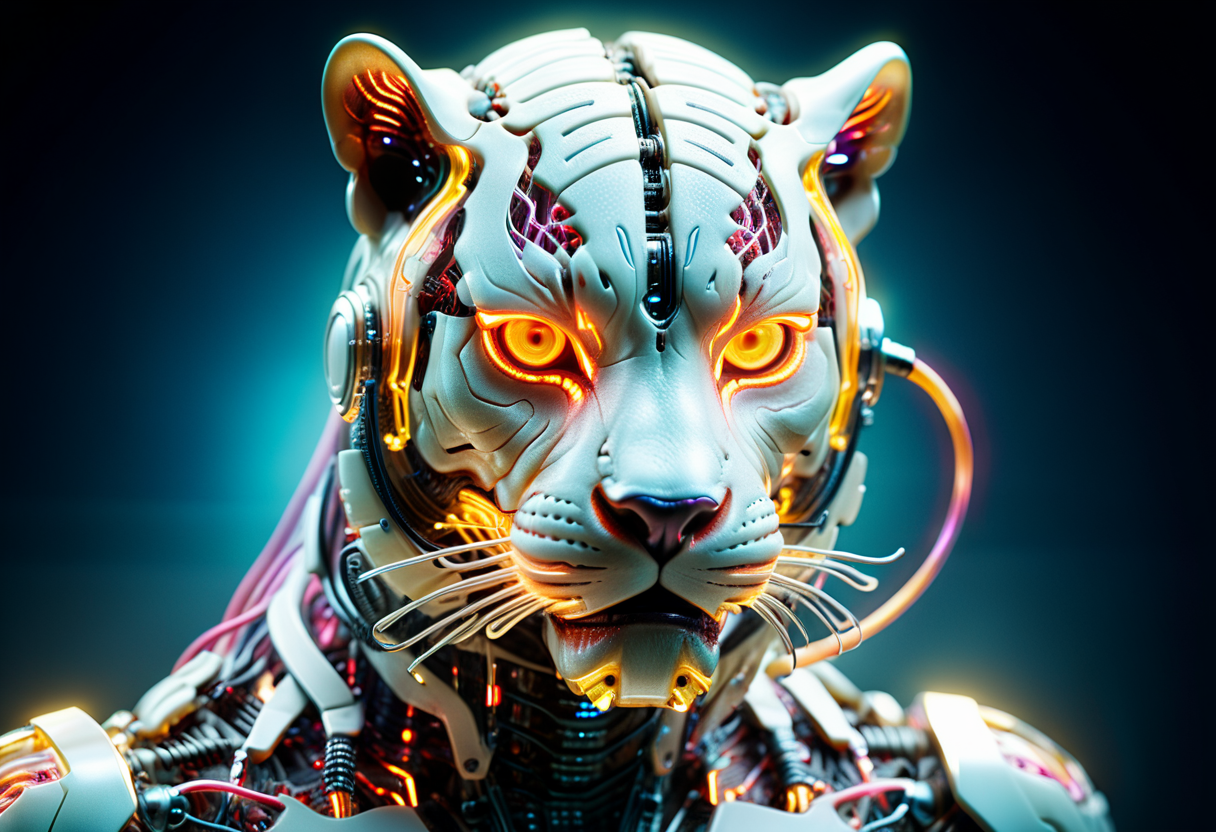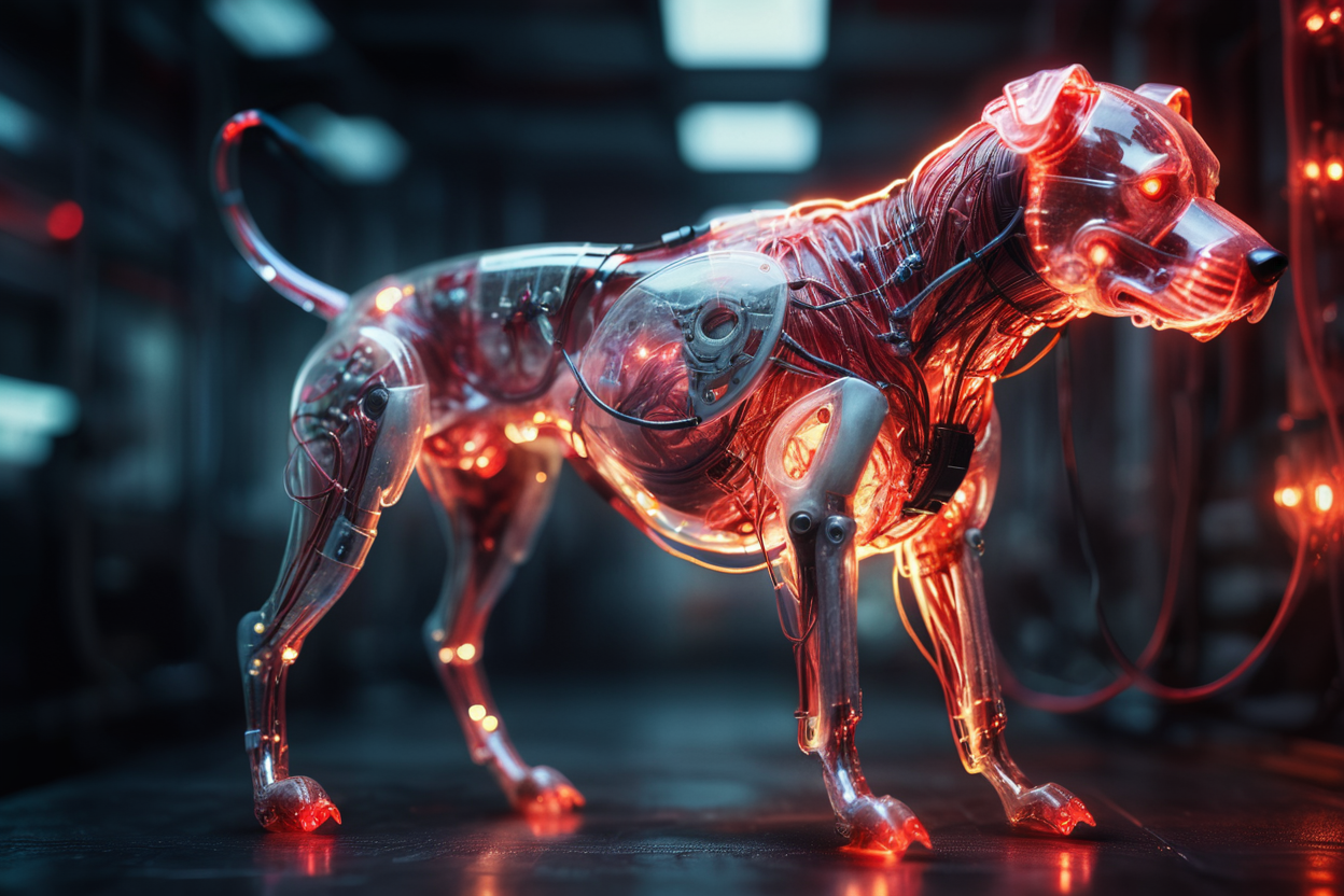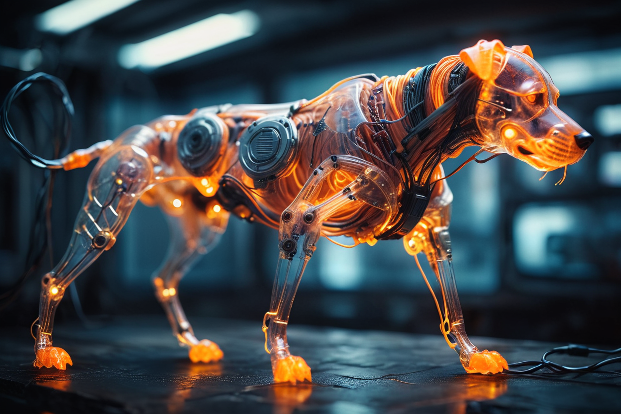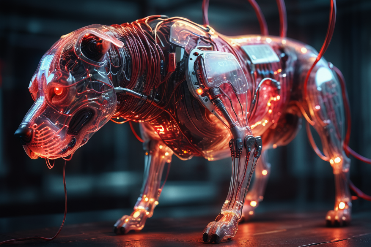 프롬프트: cinematic film still of a translucent (cybernetic-like:1.3) {dog|frog|tiger}, {red|blue|green|rainbow-colored} (glowing veins cables:1.1), circuits, titanium transparent body, biomechanical, extremely detailed, vignette, bokeh, moody, epic, gorgeous, film grain, grainy