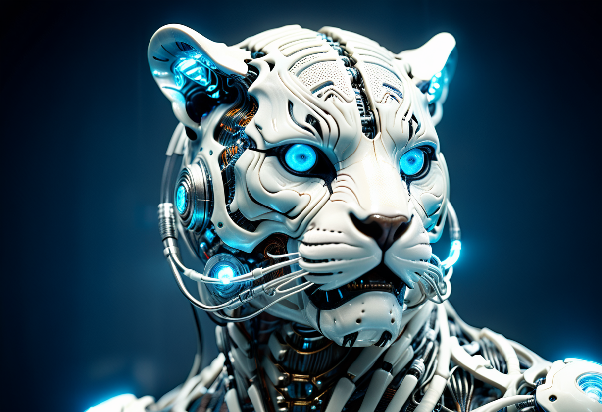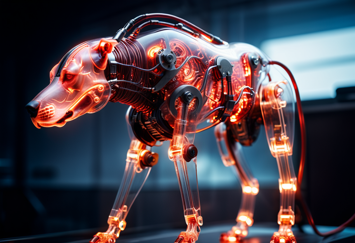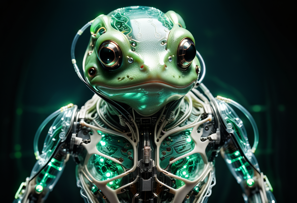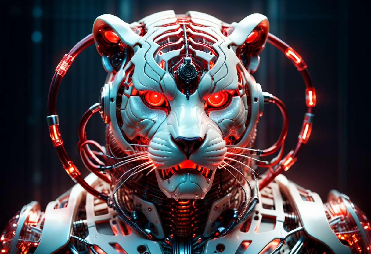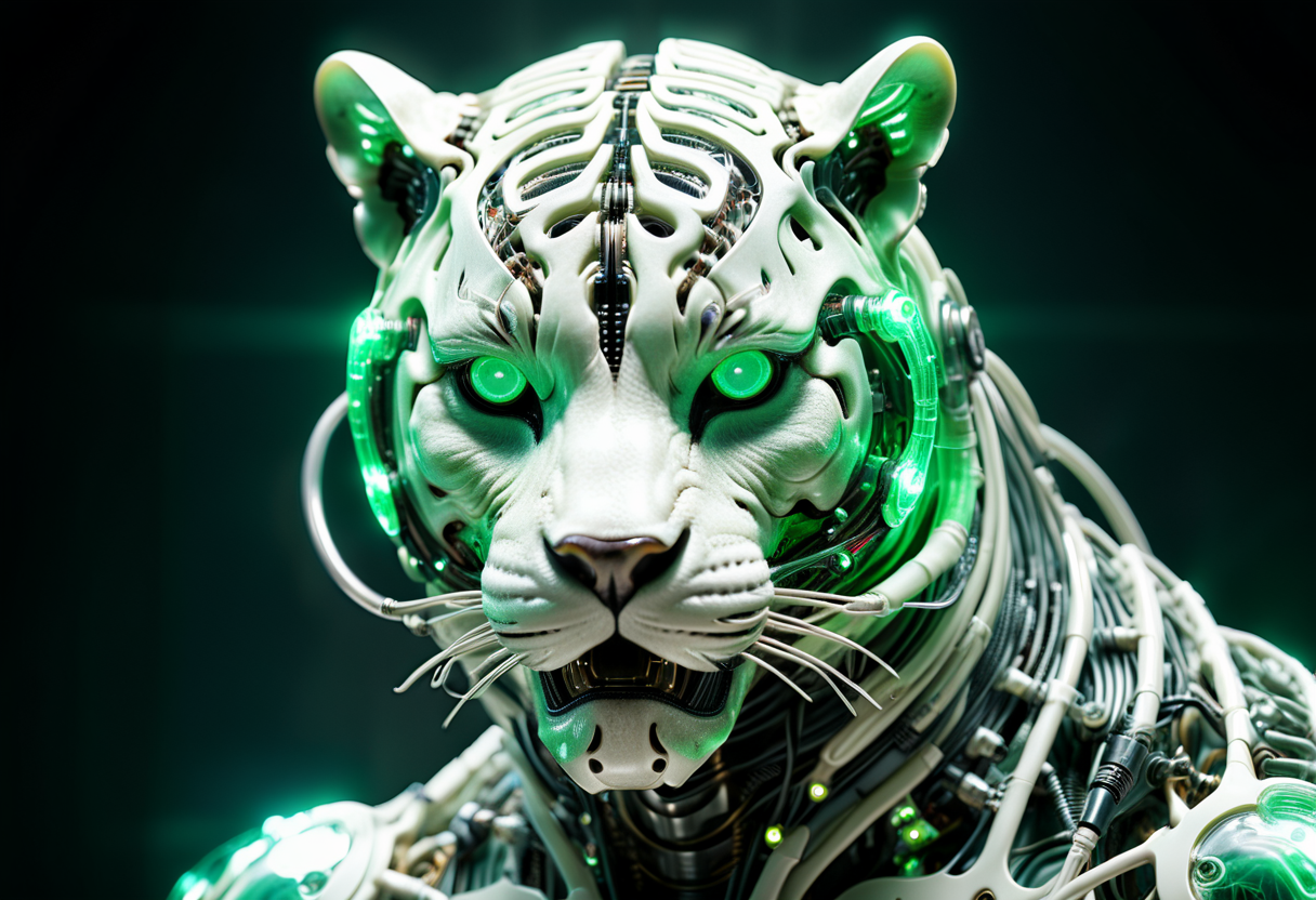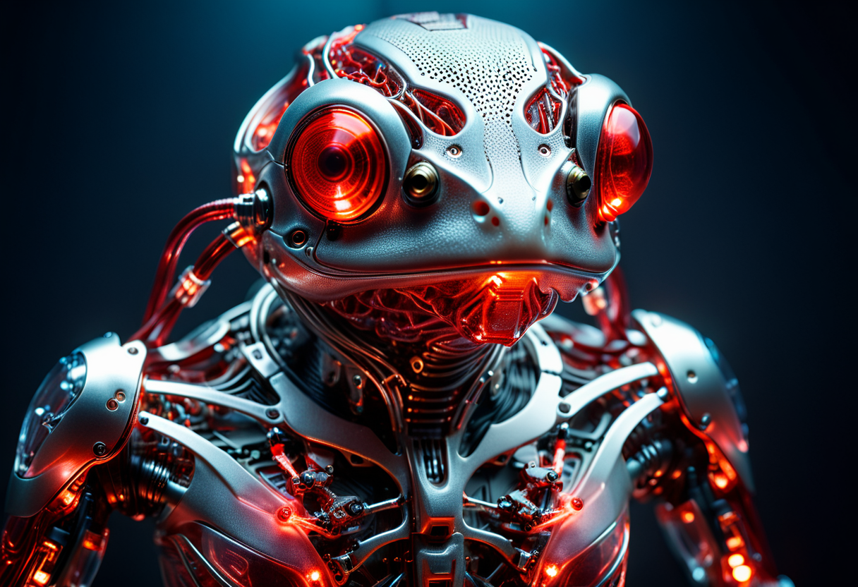 프롬프트: cinematic film still of a translucent (cybernetic-like:1.3) {dog|frog|tiger}, {red|blue|green|rainbow-colored} (glowing veins cables:1.1), circuits, titanium transparent body, biomechanical, extremely detailed, vignette, bokeh, moody, epic, gorgeous, film grain, grainy