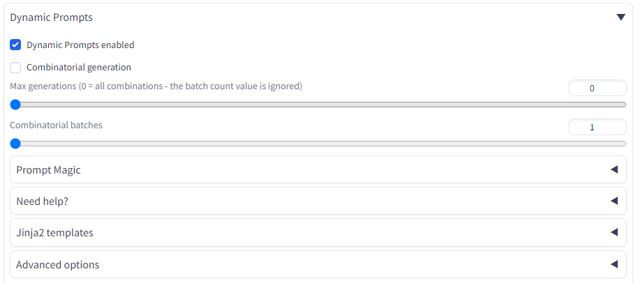 조금 아래로 내려가면 Dynamic Prompt 영역이 있는데 이것을 펼쳐보면 아래와 같이 기본으로 적용이 되도록 설정되어 있습니다. 사실 이렇게 펼치지 않아도 자동으로 적용됩니다.