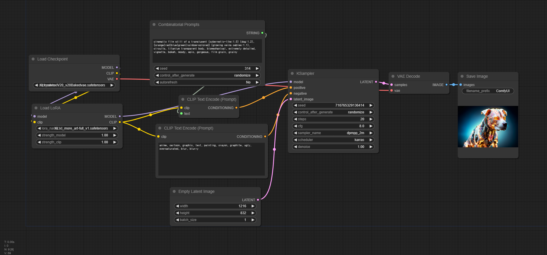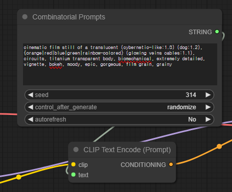 이 워크플로는 메뉴에서 [Load Default]를 누를 때 나오는 기본 워크플로에 [Combinational Prompts]를 넣은, 매우 간단한 워크플로입니다. 프롬프트를 입력하는 [CLIP Text Encode(Prompt] 노드에서 text widget을 input으로 바꾸고(노드에서 우클릭한 한 후 "convert text widget to input"을 클릭하면 됩니다), [Combinational Prompts]와 연결한 것 뿐입니다.