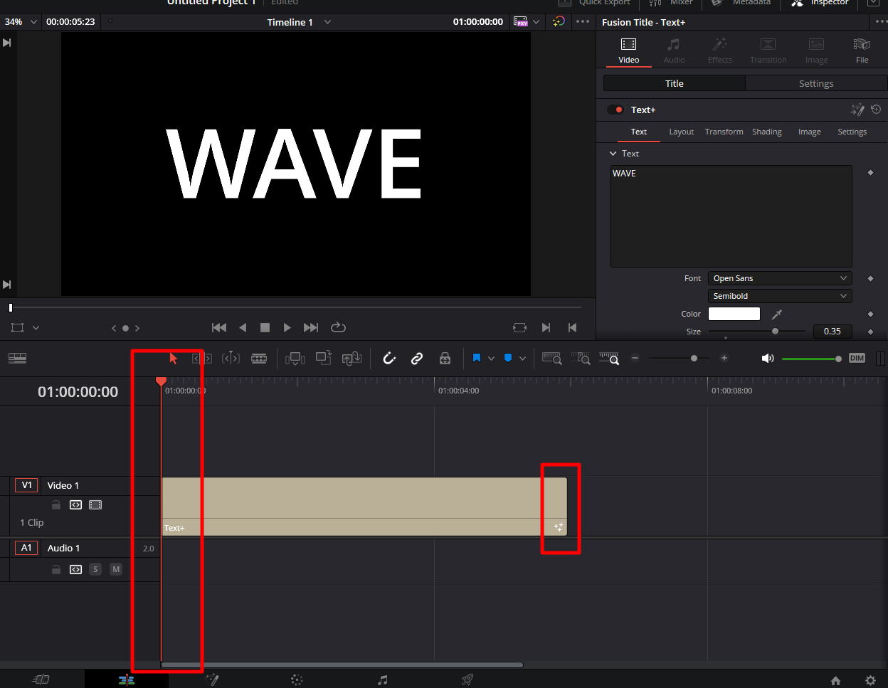 이렇게 설정하면 처음에는 [W A V E] 처럼 벌어져 있다가 3초쯤 부터는 [WAVE]로 표시가 됩니다. 이는 Edit 페이지에서 Timeline 막대를 이리저리 움직여 보거나, 그 위쪽에 있는 플레이 버튼을 눌러서 확인할 수 있습니다.