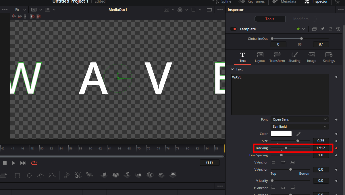 그 다음에는 Fusion 페이지로 들어가서 텍스트가 충분히 벌어지도록 Tracking 값을 적당히 조절합니다.