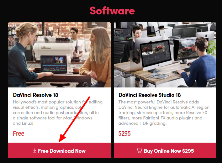텍스트 애니메이션을 생성하기 위한 비디오 편집프로그램은 Da Vinci Resolve를 사용합니다. 아래로 내려가면 아래와 같은 화면을 볼 수 있는데, Free Download Now를 누르면 등록한 후 다운로드 받을 수 있습니다.