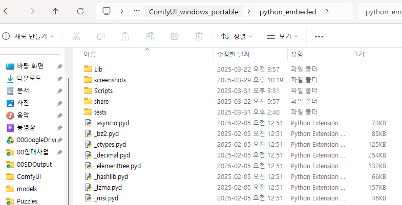먼저 ComfyUI의 Python 폴더로 들어갑니다(대부분 ComfyUI_windows_portable\python_embeded 일겁니다).