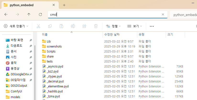 먼저 ComfyUI의 Python 폴더로 들어갑니다(대부분 ComfyUI_windows_portable\python_embeded 일겁니다).