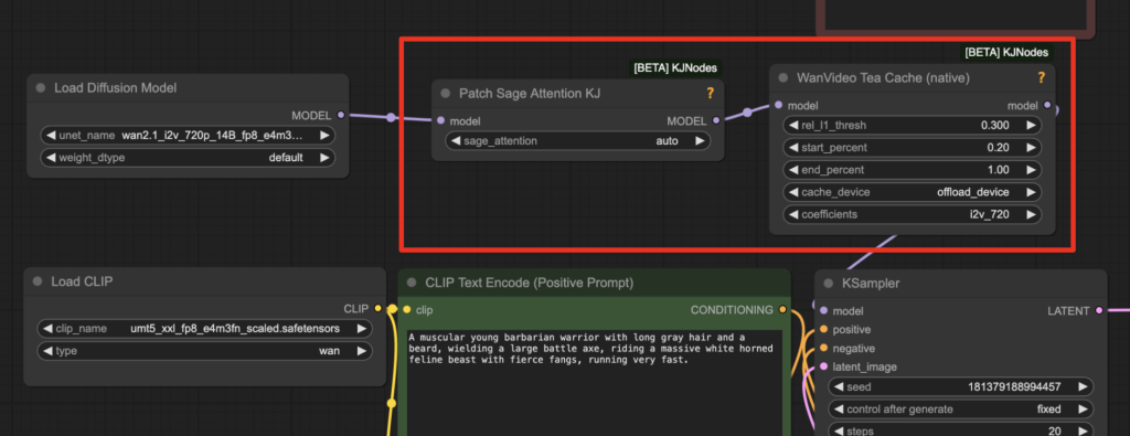 이 워크플로는 KJNodes의 Sage Attention과 Teacache 노드를 사용합니다. 이를 통해 원래의 Wan 2.1 워크플로보다 약 30% 정도 빠르게 수행됩니다.
