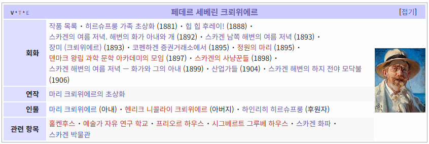 이번 페데르 세베린 크뢰위에르 위키백과 정리는 간단했습니다. 원래 없던 틀:페데르 세베린 크뢰위에르를 번역하고 언어링크가 5 이상인 문서를 찾아 모두 번역하면 되었습니다. 아래에 있는 문서중 제가 번역하지 않은 건 아내인 마리 크뢰위에르 단 한명 뿐이네요. 빨간 색으로 남아 있는, 아직 번역되지 않은 작품은 언어링크가 5 아래인 문서들입니다. 언젠가 기회가 있으면 다시 번역할 수 있겠죠.