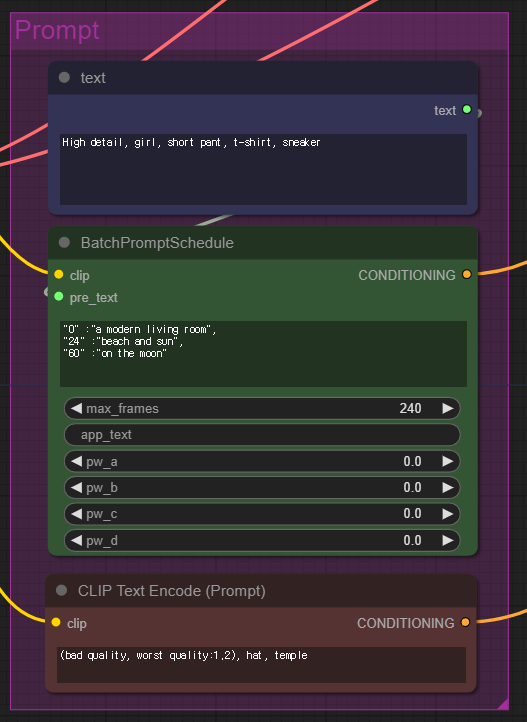 그리고 가운데 있는 [Batch Prompt Schedule]은 위의 기본 프롬프트와 함께 사용되며, 시간에 따라 프롬프트를 바꾸는 역할을 합니다. 예를 들어 0~23 프레임에서는 "High detail, girl, short pant, t-shirt, sneaker, a modern living room"이라는 프롬프트로 이미지가 생성되며 24~59 프레임에서는 " High detail, girl, short pant, t-shirt, sneaker, beach and sun"이라는 프롬프트가 적용됩니다. 이 [Batch Prompt Schedule] 노드 덕분에 배경이 바뀌는 것입니다.