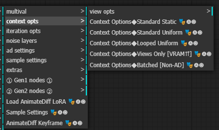 - context_options(선택) - context opts 서브메뉴에 있는 [Context Options] 노드 - AnimateDiff 모델의 sweetspot을 되돌릴 필요가 있을 때 사용하는 것이 좋다.
