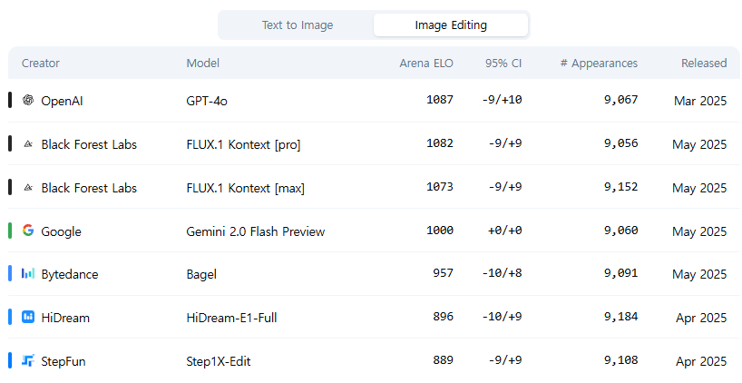 그런데 최근에 등장한 Image Editing 리더보드에서는 GPT-4o 에 이어 2등을 차지하고 있습니다. (단, 이 리더보드는 미드저니나 Imagen 4 등이 빠져 있어 완전하지는 않네요)