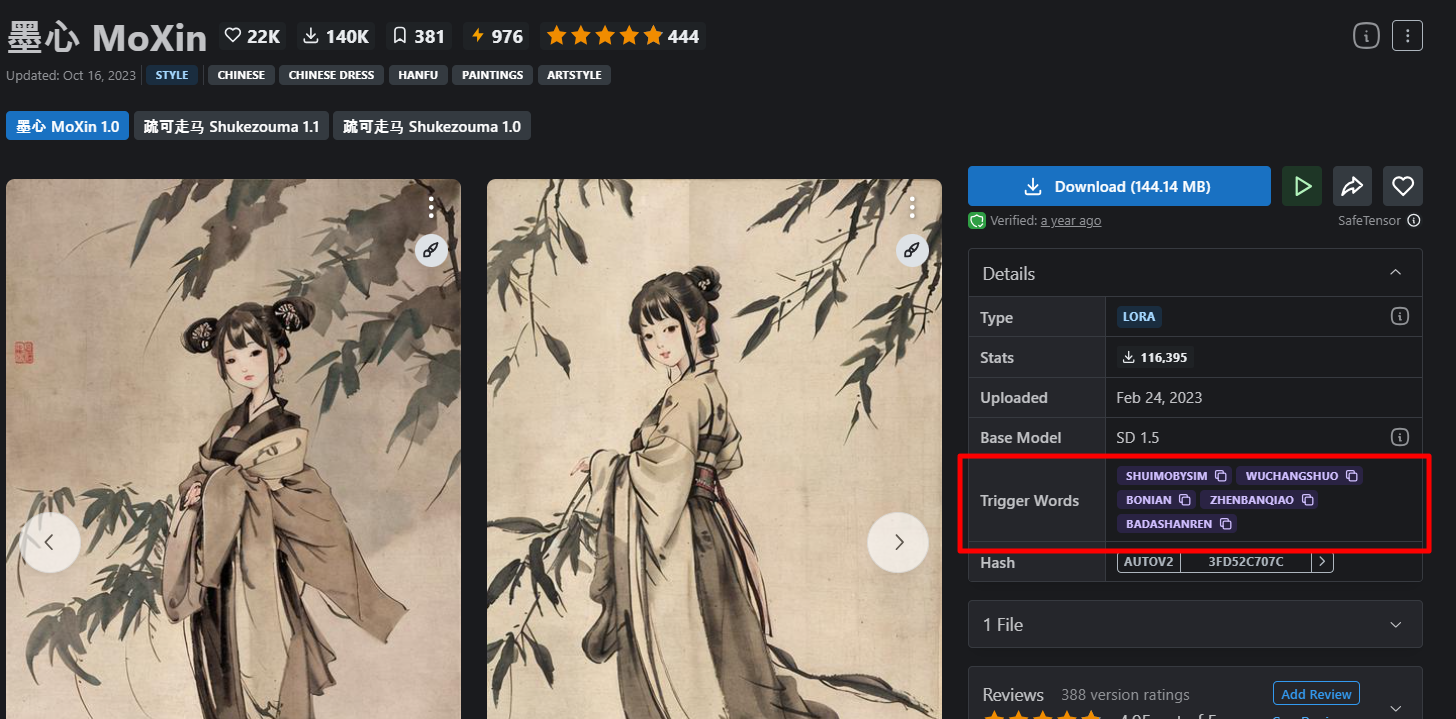 LoRA는 LoRA에 따라 성능이 발휘하는 조건이 다릅니다. 가장 중요한 것은 체크포인트 모델과의 조화입니다. 해당 LoRA의 스타일을 잘 드러내주는 체크포인트 모델이 있다는 것입니다. 또한 아래 그림에서 보는 것처럼 LoRA 파일을 발현시켜주는 "Trigger Words"가 따로 있는 경우가 있는데, 이때는 프롬프트에 해당 단어가 포함되어야 합니다. 아울러, CFG 값이나 가중치(weight)등도 중요할 수 있습니다. 이러한 사항은 대개 LoRA 파일 사이트에 적혀있으니 가능하면 찾아서 적용하는 것이 좋습니다.