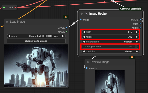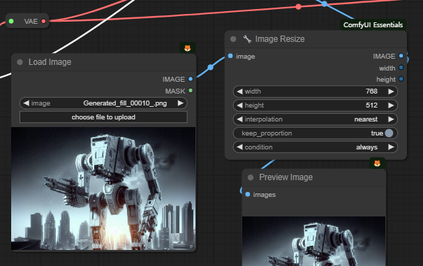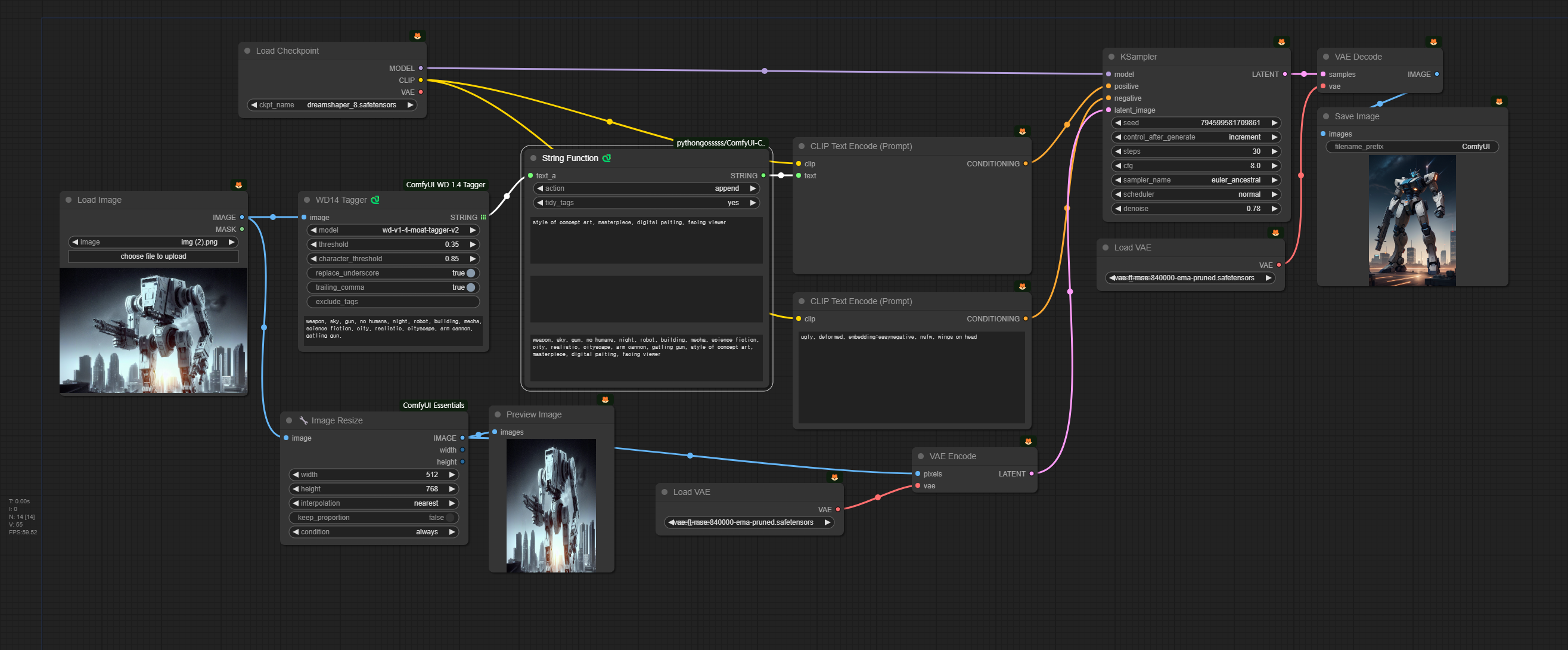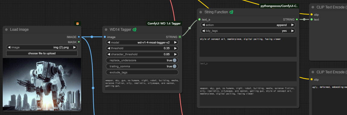 그런데 n>[CLIPText Encode]n> 에 입력되는 텍스트가 생성되는 구조를 보면 [Load Image] -> [WD14 Tagger] -> [String Function] -> [CLIPText Encode] 순으로 연결되어 있습니다. 여기에서 [WD14 Tagger]n> 노드는 [Load Image]의 이미지를 받아 분석해 프롬프트를 생성하는 역할을 합니다(AUTOMATIC1111의 Interrogate 와 비슷합니다). 입력된 로봇 "weapon, sky, gun, no humans, night, robot, building, mecha, science fiction, city, realistic, cityscape, arm cannon, gatling gun" 이라고 해석을 했네요.
