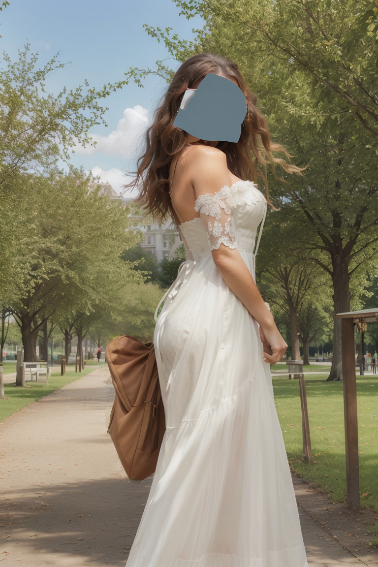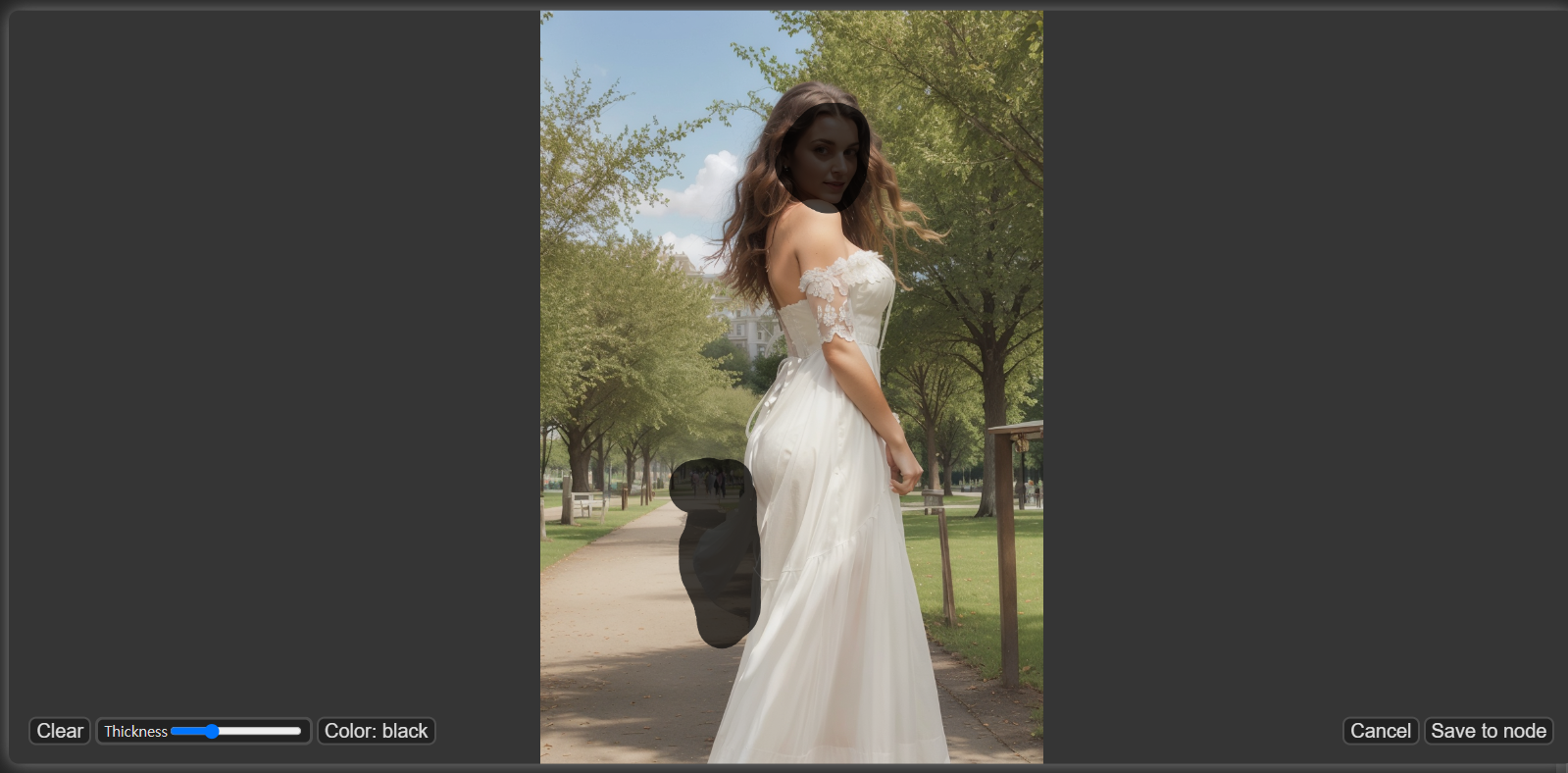 인페인트를 위해서는 마스크(새로 그릴 부분)를 지정해야 합니다. 마스크를 생성하는 방법은 간단합니다. [Load Image] 노드에서 이미지를 우클릭하면 긴 메뉴가 나오는데, 거기서 "Open in MaskEditor] 를 선택하면 아래와 같은 창이 열립니다. 여기에서 바꾸고자 하는 부분을 그려준 후, 맨 마지막에 오른쪽 아래의 [Save to node] 버튼을 클릭면 됩니다. 저는 얼굴과 드레스 뒤쪽이 날리는 부분을 마스크로 지정했습니다.