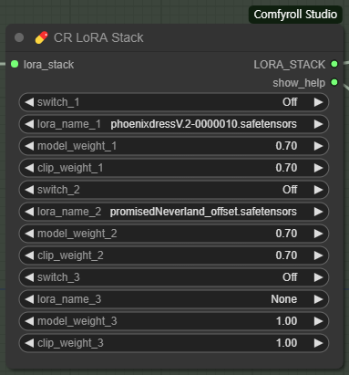 [CR LoRA Stack] 노드에는 각각의 LoRA를 끄거나 켤수 있는 switch가 있고, 아래쪽에 모델 및 CLIP에 대한 가중치를 설정할 수 있습니다.