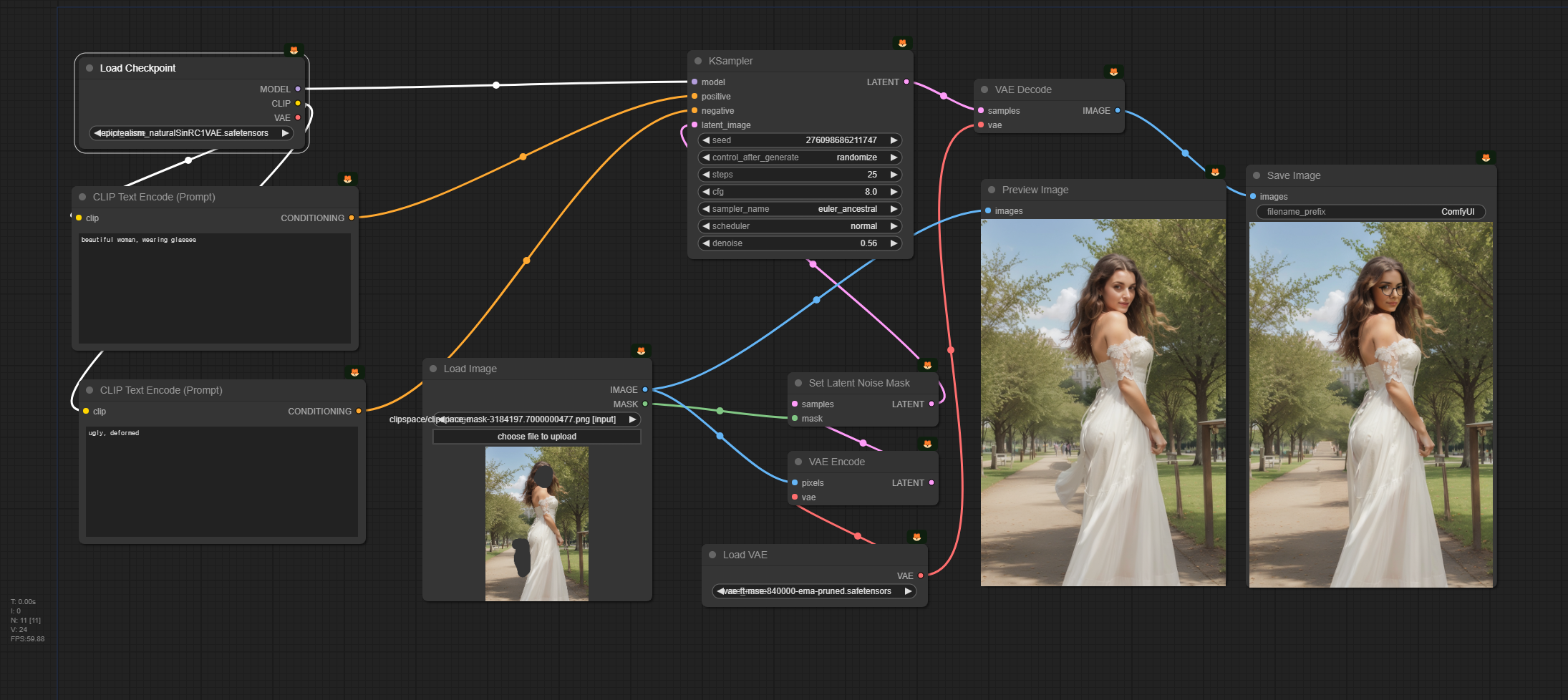 아래는 이미지 마스크를 지정해서 얼굴을 새로 그리는 인페인트(inpaint) 워크플로입니다.