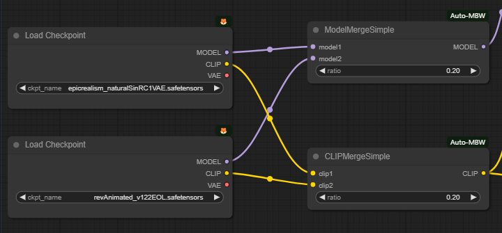 기본적으로 이 워크플로는 두 개의 체크포인트 모델을 사용하는 방법입니다. 이렇게 두개의 모델을 사용하는 이유는 revAnimated 모델이 색감과 구도가 좋게 나오기 때문에 사용한 것이고, 이렇게 생성된 이미지를 n>epicRealism 모델을 사용해서 실사 사진에 가깝게 만들고자 하는 것이라고 합니다.