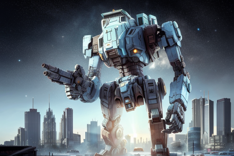 아래는 이 워크플로를 그대로 사용해 생성한 이미지입니다. 디테일은 다르지만 전체적으로 비슷한 형태의 거대 전투 로봇이 생성되었습니다. 이렇게 비슷한 이미지가 생성된 것은 잡음제거 강도(denoise)를 0.3으로 상당히 낮게 설정하였기 때문입니다.