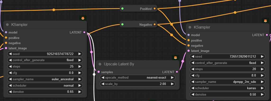 이 워크플로에서는 [KSampler] 노드가 여러번 사용되고 있습니다. 아래는 그중 첫번째로 이른바 "HiRes Fix" 프로세스입니다. 한번 생성된 이미지를 확대해서 다시한번 샘플링하여 이미지의 품질을 높이는 기술입니다. SD 1.5에서는 거의 필수적이라고 할 수 있죠. 잘 살펴 보시면 첫번째 [KSampler] 노드와 두번째 [KSampler]노드는 다른 샘플러를 사용하며, 두번째 [KSampler] 노드의 경우 잡음 제거 강도(denoise)를 0.5로 두어 원본을 유지하면서도 여러가지 변경이 가능하도록 설정하고 있습니다.