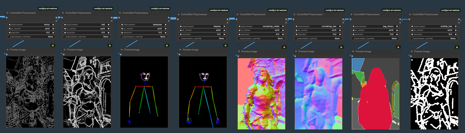 위의 워크플로 아래쪽에는 다양한 전처리기의 효과를 볼 수 있습니다. 전처리기가 어떤 종류가 있고, 어떤 데 사용하는게 효과적인지 하는 내용은 이 글을 읽어보시기 바랍니다.