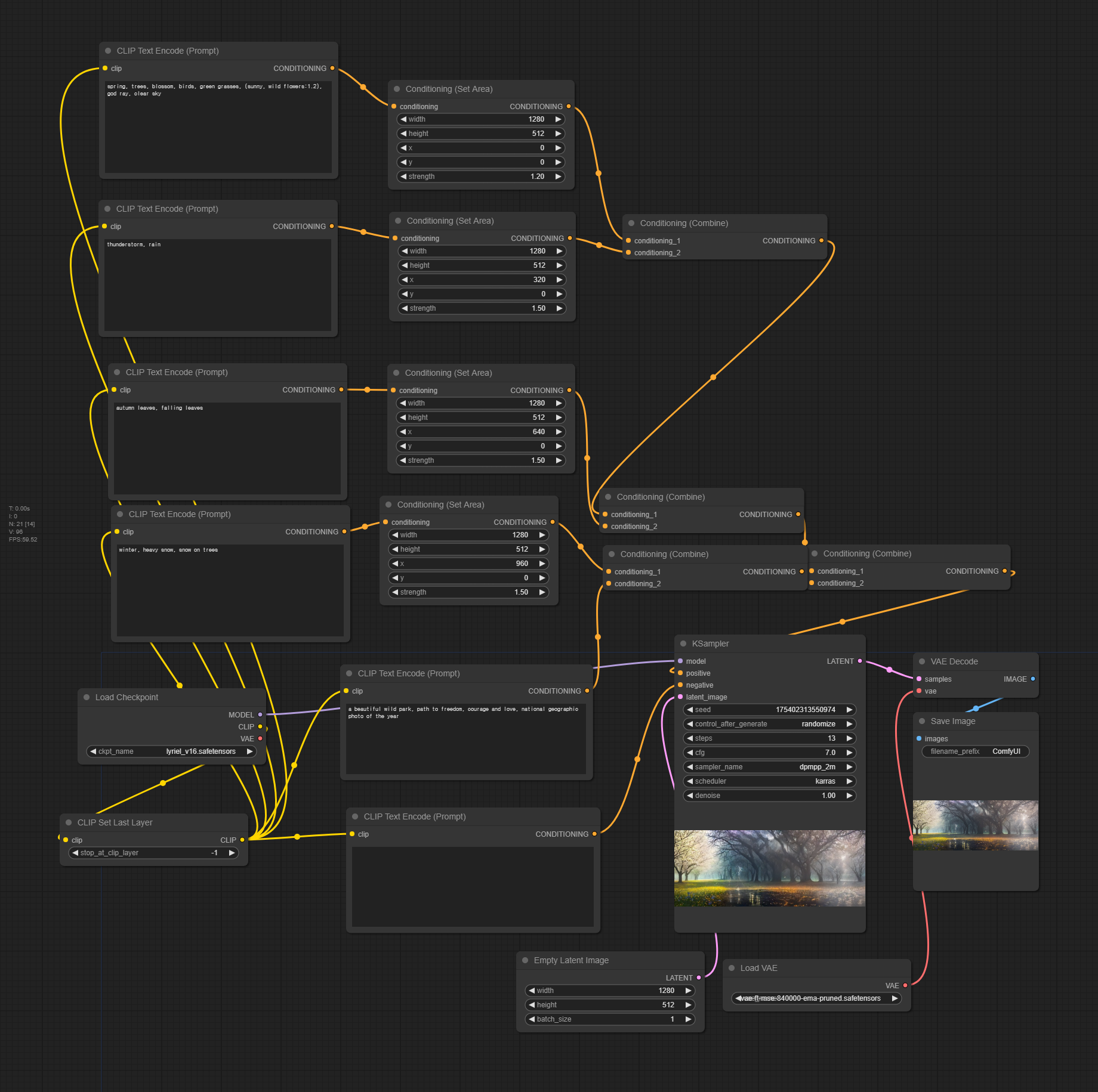 아래는 [MultiAreaConditioning] 노드를 사용해서 위에 있는 4분할 봄 여름 가을 겨울 워크플로를 구현한 것입니다. 보시는 것처럼 상당히 깔끔합니다. 특히 이 노드를 사용하지 않았을 때에 비하면 정말 보기도 좋고 이해도 쉽습니다.