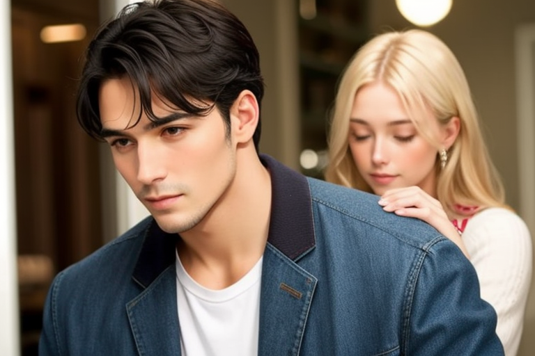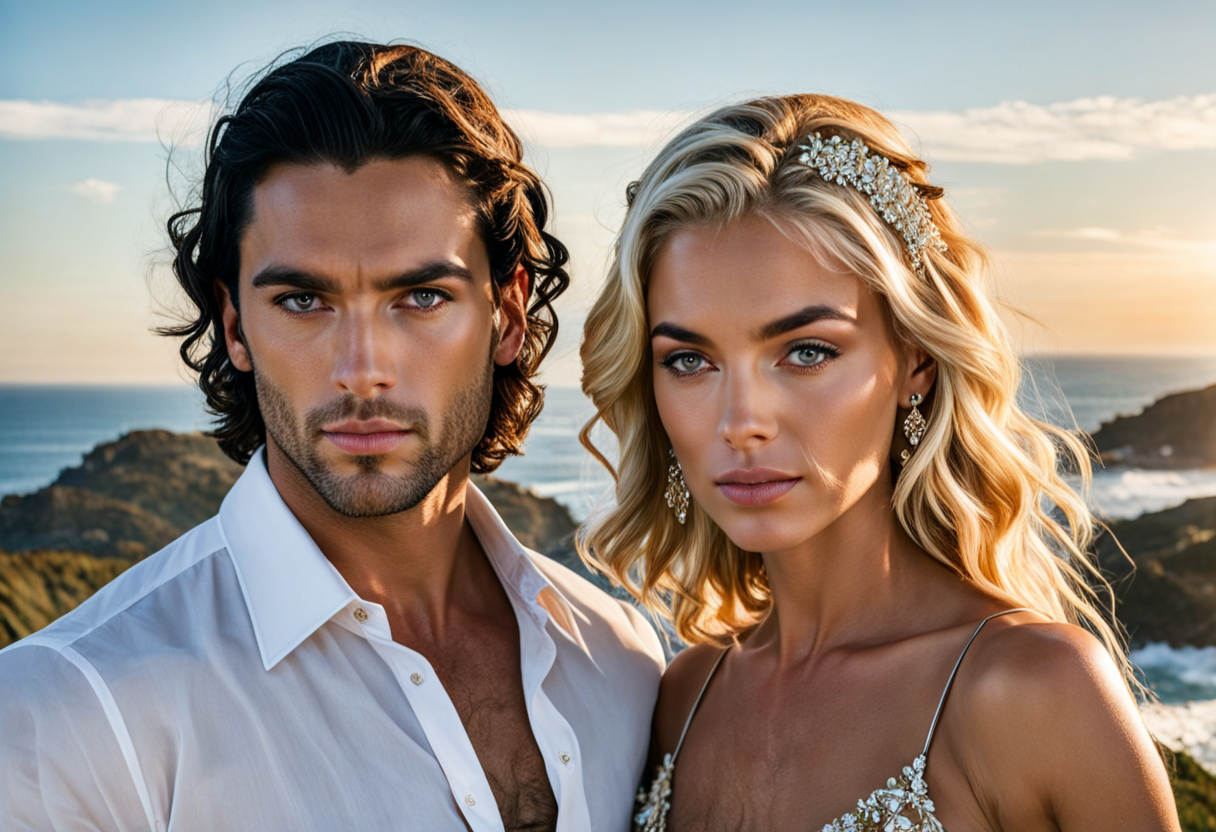 프롬프트: A picture with a man with black hair on the left and a woman with blonde hair on the right