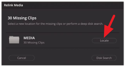- 왼쪽의 bin 목록에서 VIDEO를 선택하면 아래와 같이 Offline으로 나옴. Relink 버튼을 누르고 "R19 Beginner Guide" 폴더를 선택한 뒤 Open을 선택하면 모든 미디어가 정상적으로 표시됨