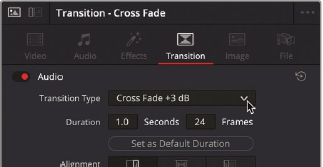 - Audio transition을 선택하고, Inspector를 클릭하면 Transition이 자동으로 선택됨. Transition Type에서 Cross Fade +3 dB를 선택