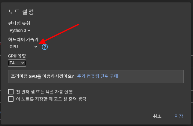 먼저 런타임 -> 런타임 유형 변경을 눌러, 아래와 같이 하으웨어 가속기가 GPU로 설정되어 있는지 확인합니다.