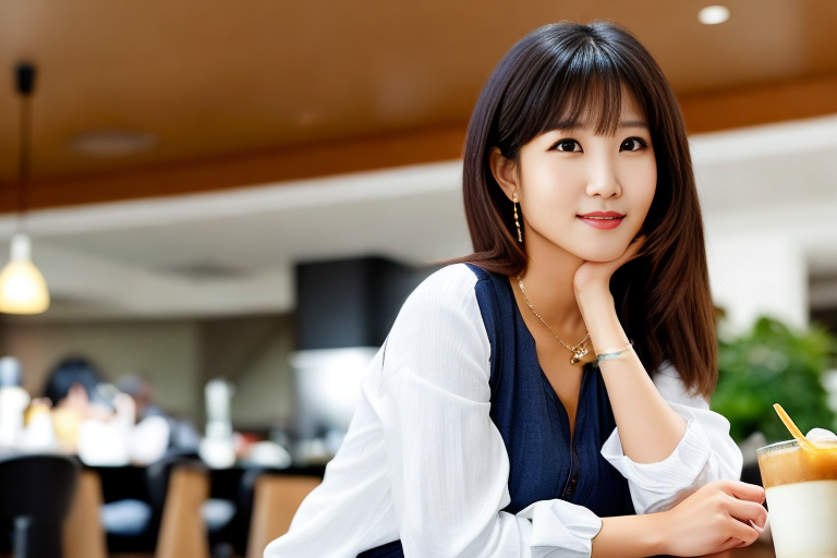 프롬프트: a photo of a bspeb, a beautiful woman sitting at a table, brown eyes, looking at me, atmospheric cafe