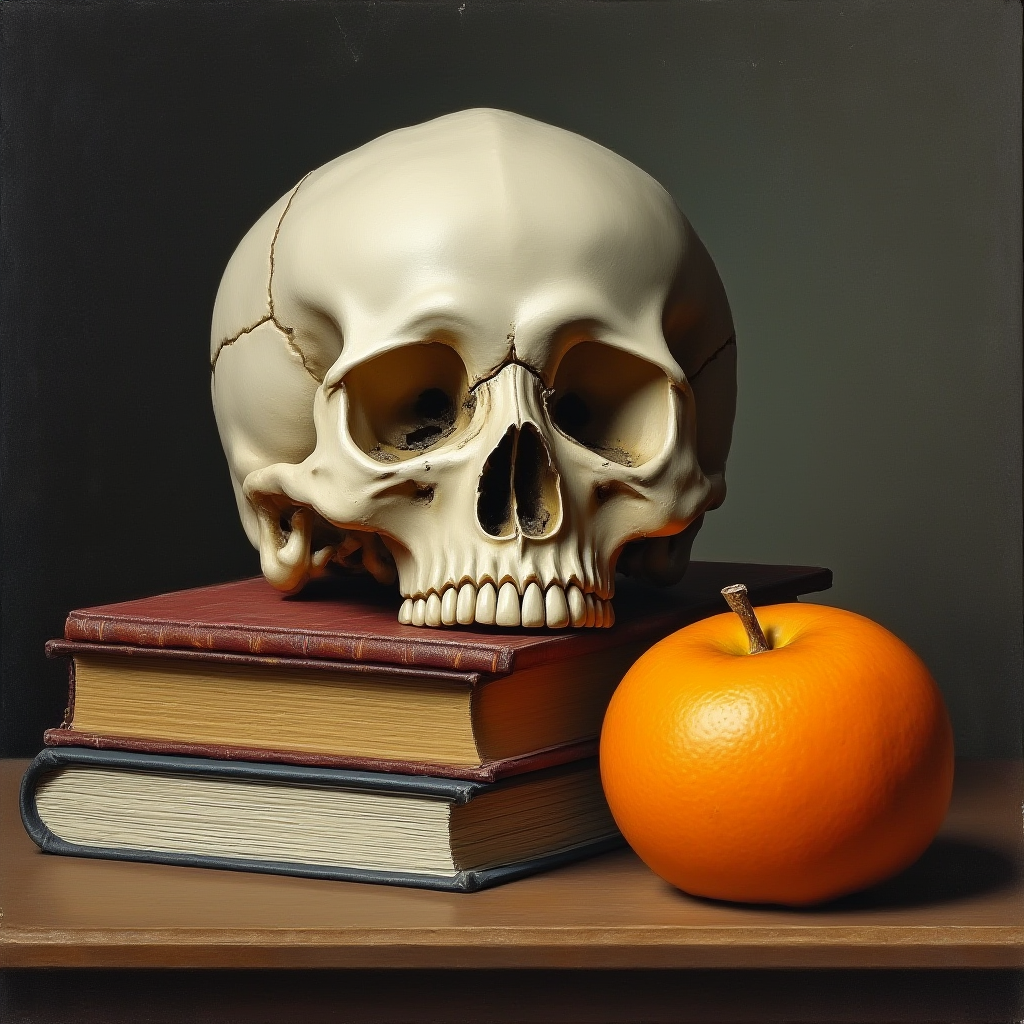 프롬프트: Still life painting of a skull above a book, with an orange on the right and an apple on the left