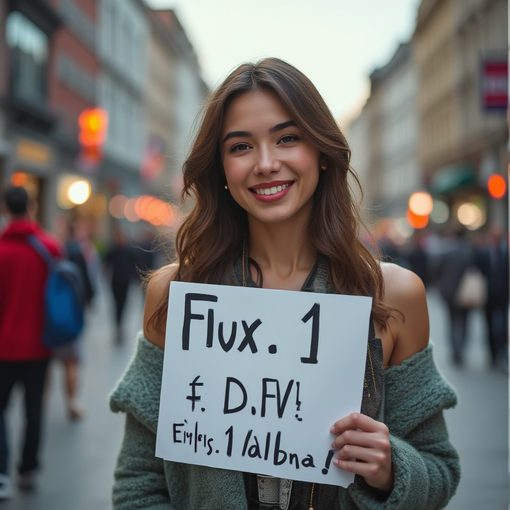 프롬프트: a portrait photo of a 25-year old beautiful woman, busy street street, smiling, holding a sign “Flux.1 dev vs Flex.1-alpha”