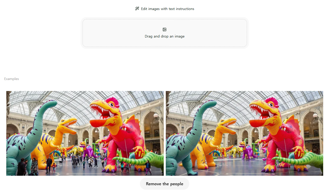 여기에서 [Edit] 를 누르면 아래와 같은 화면이 나타나며, 여기서 FLUX.1 Kontext 이미지 편집 기능을 시험해 볼 수 있습니다. 아래쪽에는 예제들이 있으므로 기능을 미리 살펴볼 수 있습니다.