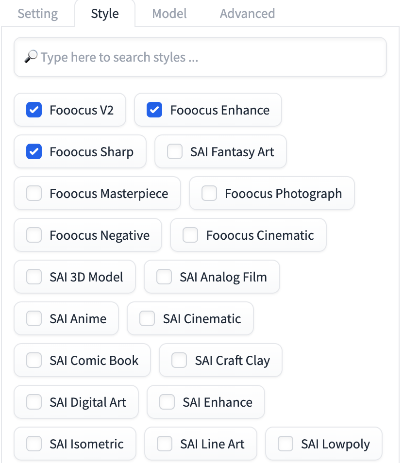 일반적으로 AUTOMATIC1111과 같은 스테이블 디퓨전 GUI에서는 프롬프트 작성법에서 말씀드린 것처럼 스타일, 해상도, 조명 등 다양한 영역의 단어들을 사용해야 좋은 이미지가 생성됩니다. 하지만, Fooocus에서는 Style 탭에 포함된 여러가지 스타일을 선택하기만 해도 멋진 이미지가 탄생합니다.