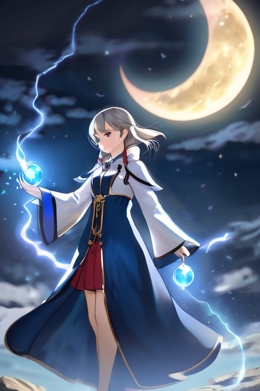 프롬프트: a 25 year old mage, dress, full body, magic, lightning, rim light, moon, night