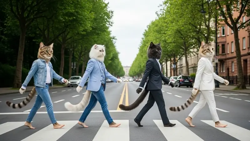 Four figures with the heads and tails of cats and human bodies with cat paws for hands and feet walk barefoot across a crosswalk with black and white stripes. They move from left to right, occupying the lower half of the frame, and all face towards the right side of the image.