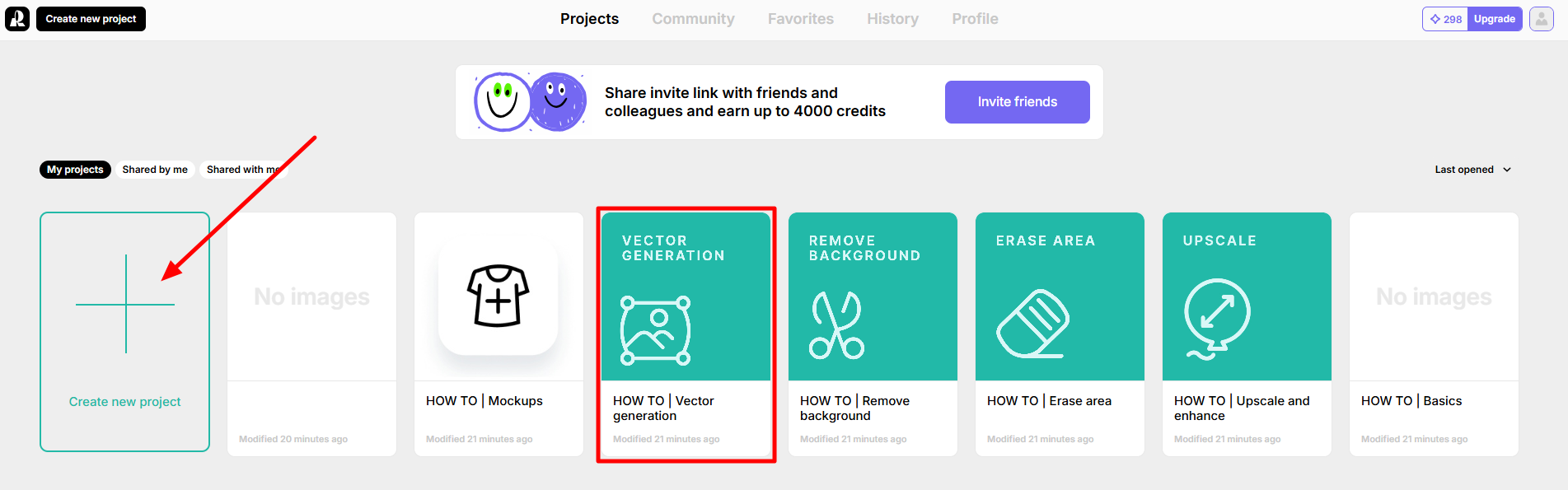 가입후 https://www.recraft.ai/projects 에 접속을 하면 아래와 같이 여러가지 도구를 볼 수 있습니다. 여기에서 맨 왼쪽에 있는 [Create new project]를 누르면 작업을 시작할 수 있는데, 그 전에 [VECTOR GENERATION]을 누르면....
