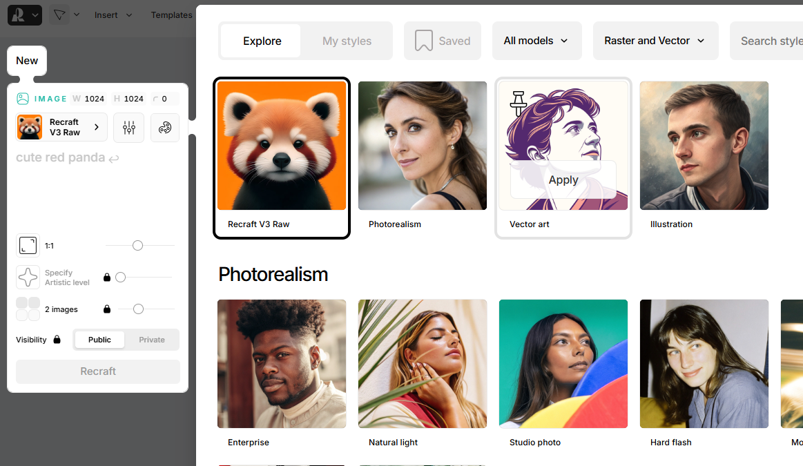 가장 먼저 레드 판다 아이콘을 누르고, 어떤 이미지를 생성할 것인지를 선택합니다. 여기에서는 "Vector art"를 선택합니다만, 아래로 내려가보면 일러스트, 로고, 아이콘, 기타 100여가지에 달하는 스타일이 있으니 살펴보시고 선택하시면 됩니다.