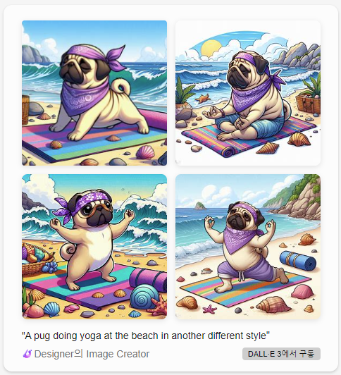 위에서는 너무 현실적인 그림을 그렸는데, 이번엔 완전 초현실적인 그림을 그려보도록 하겠습니다. "바닷가에서 요가하는 퍼그"를 그려달라는 요청에 아래의 이미지를 생성합니다.
