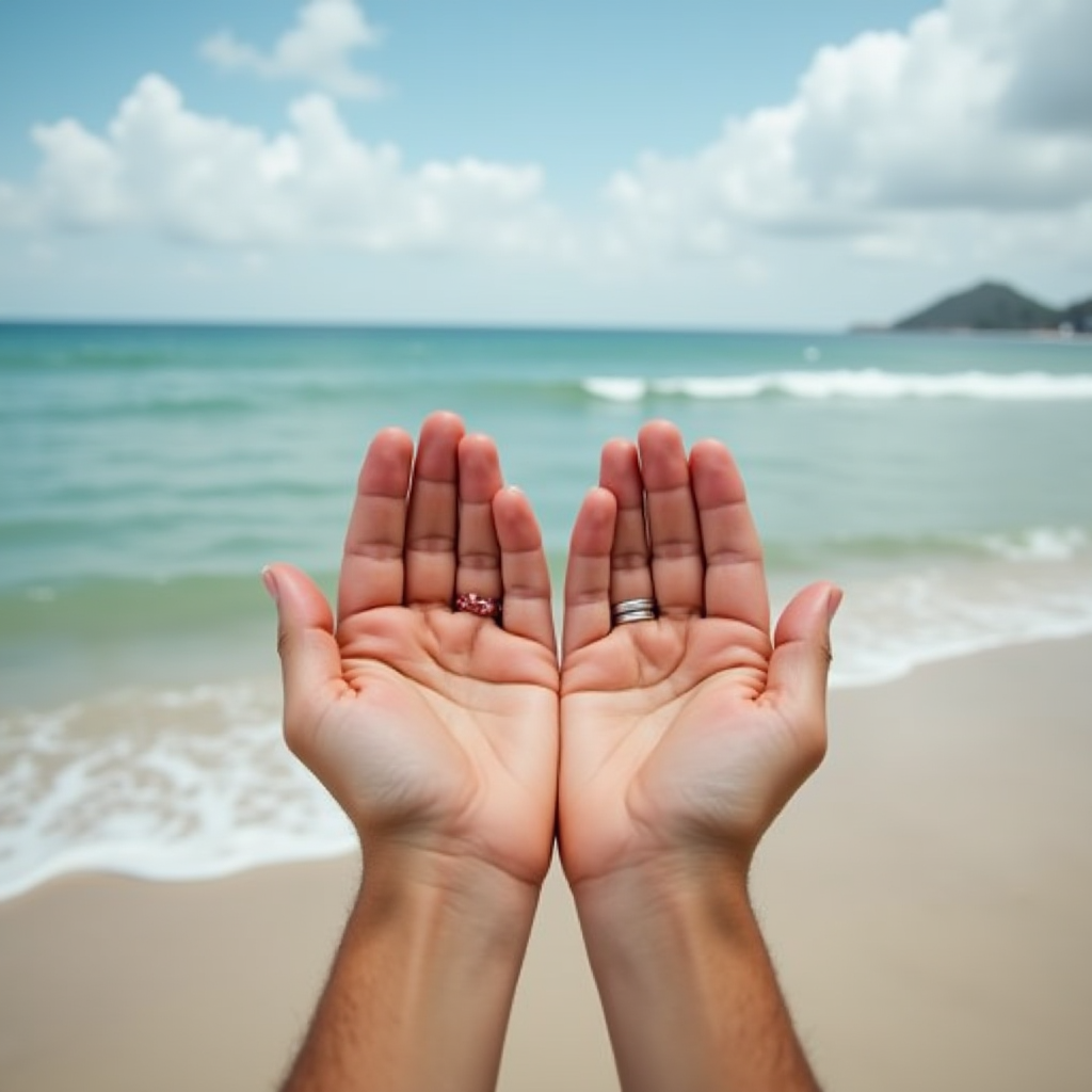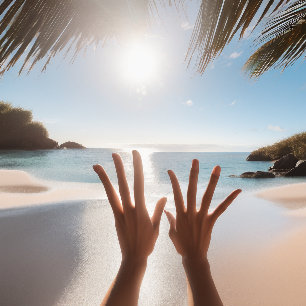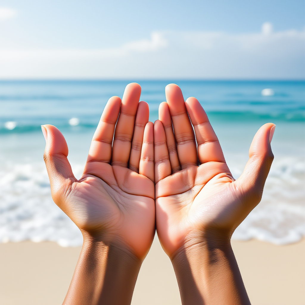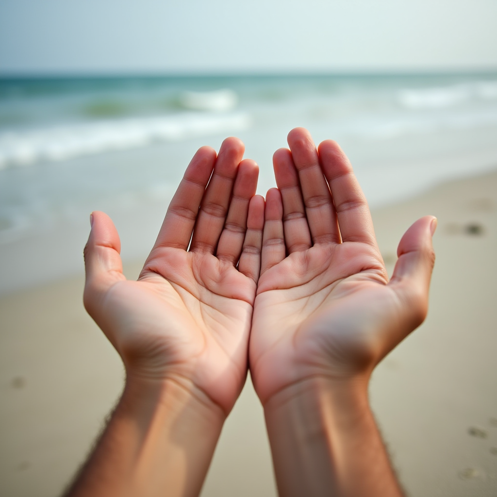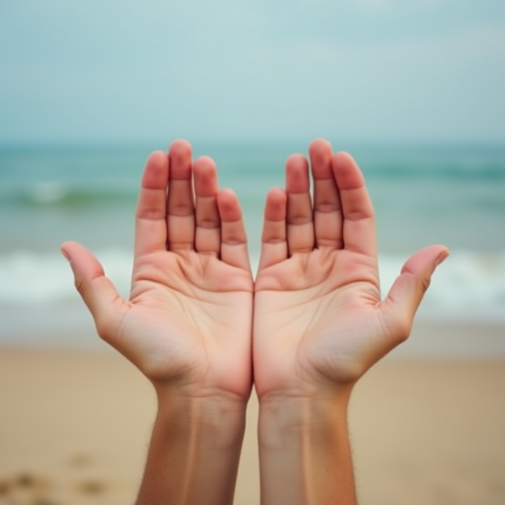 프롬프트: photo of open palms, detailed fingers, beach, sea