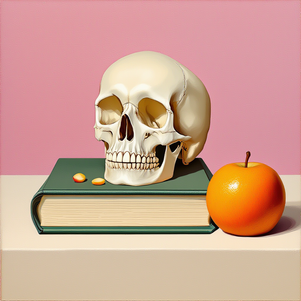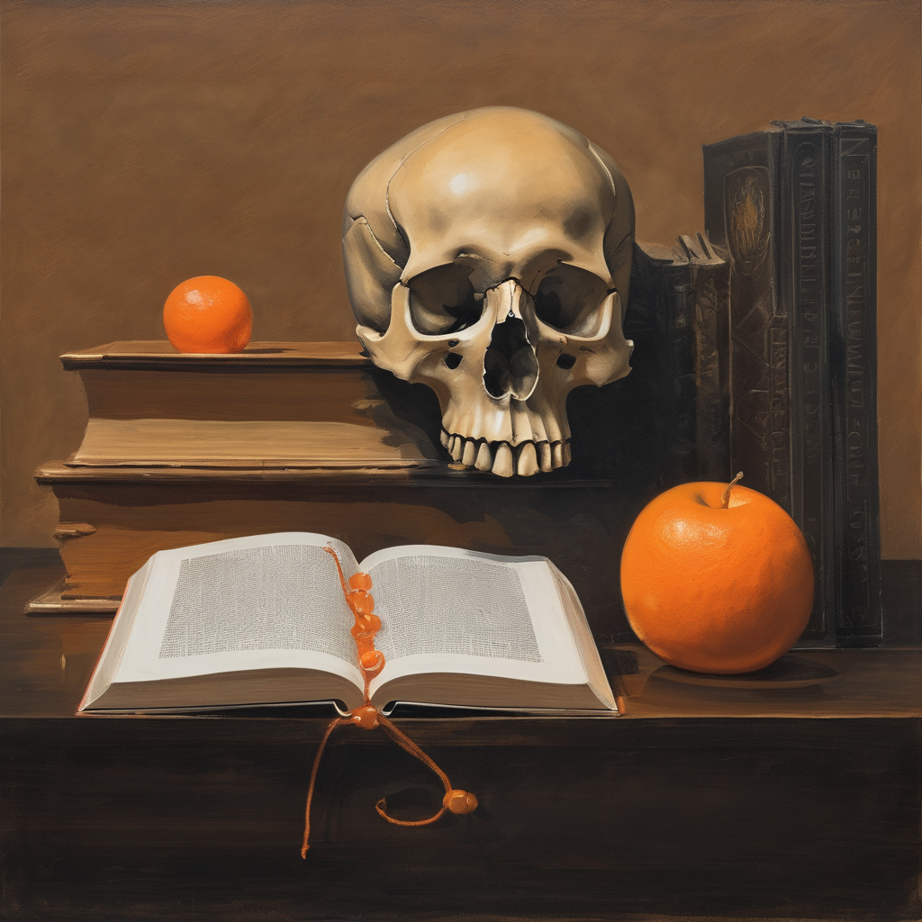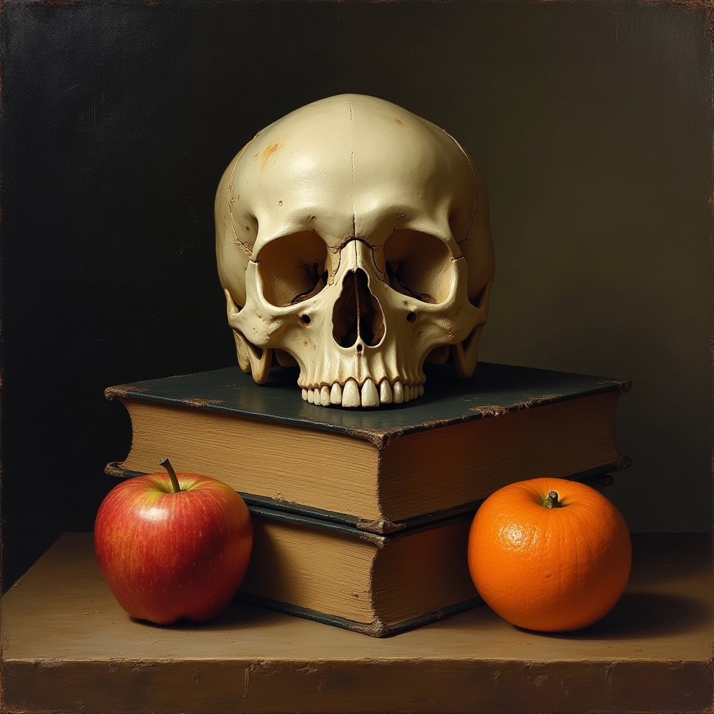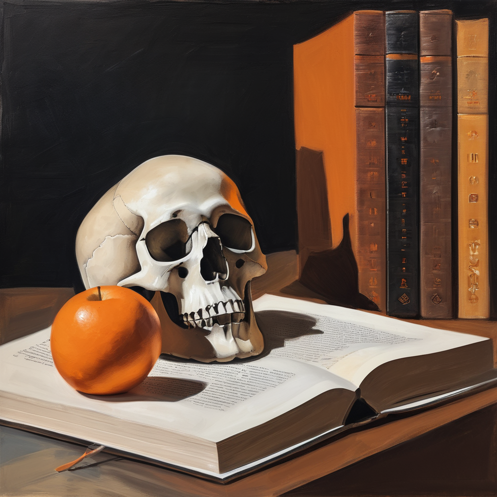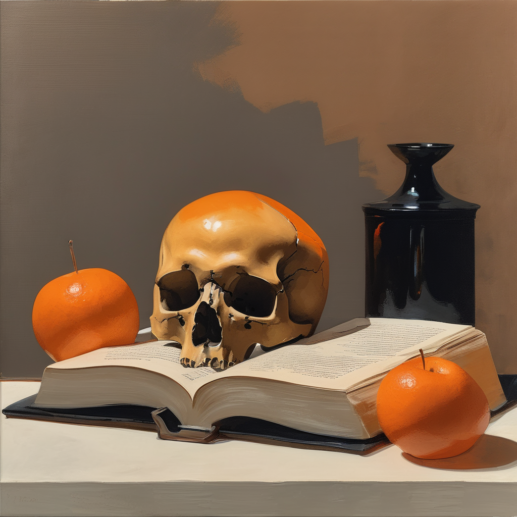 프롬프트: Still life painting of a skull above a book, with an orange on the right and an apple on the left